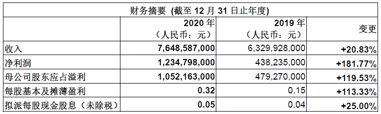 2021年3月24日–公司公布截至2020年12月31日止年度之全年業績。2020年度業績全面向好,核心指標同比大增實現翻倍,每股派發現金紅利人民幣0.05元(稅前)