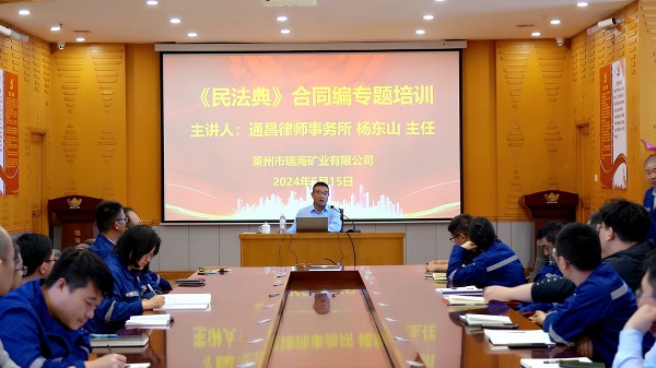 為進一步提升依法治企工作水平,增強企業員工對民法典合同編的理解與運用。近日,瑞海礦業特別邀請招遠市律師協會會長、山東通昌律師事務所楊東山主任開展民法典合同編專題培訓講座。