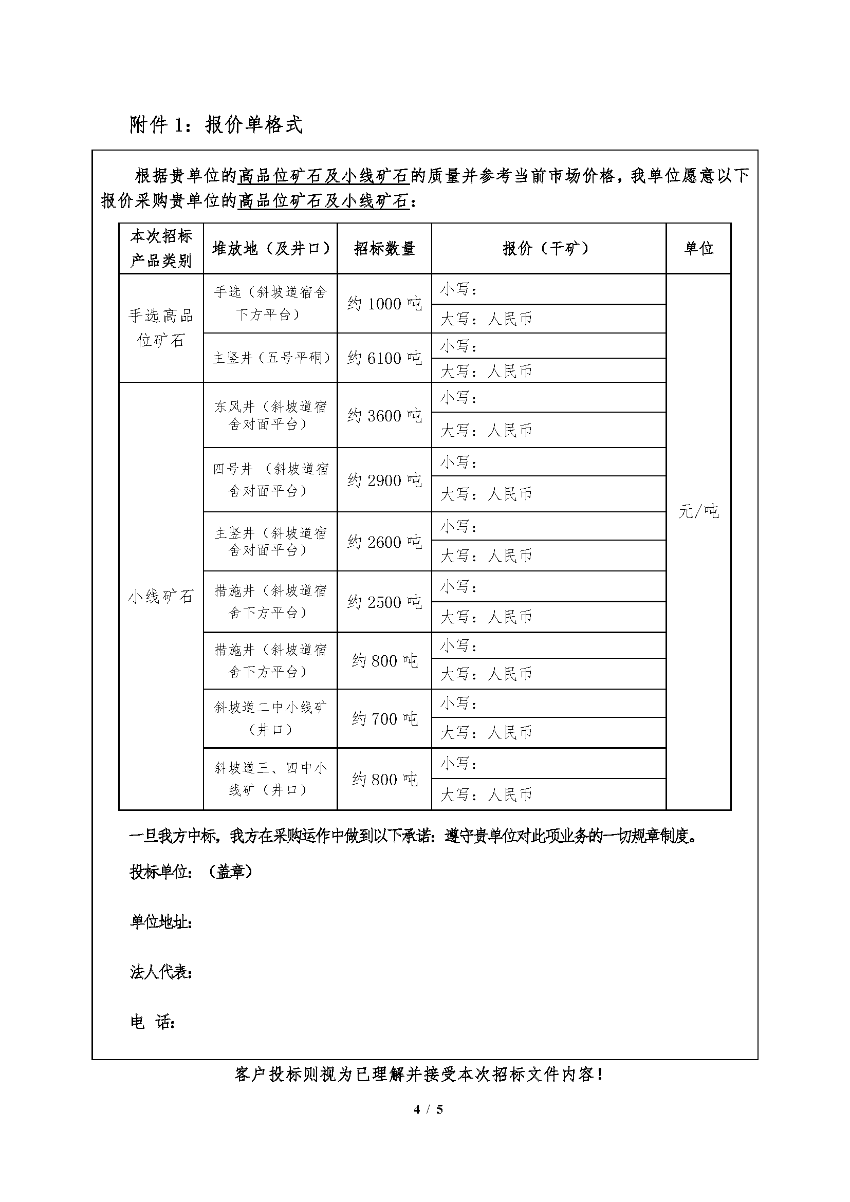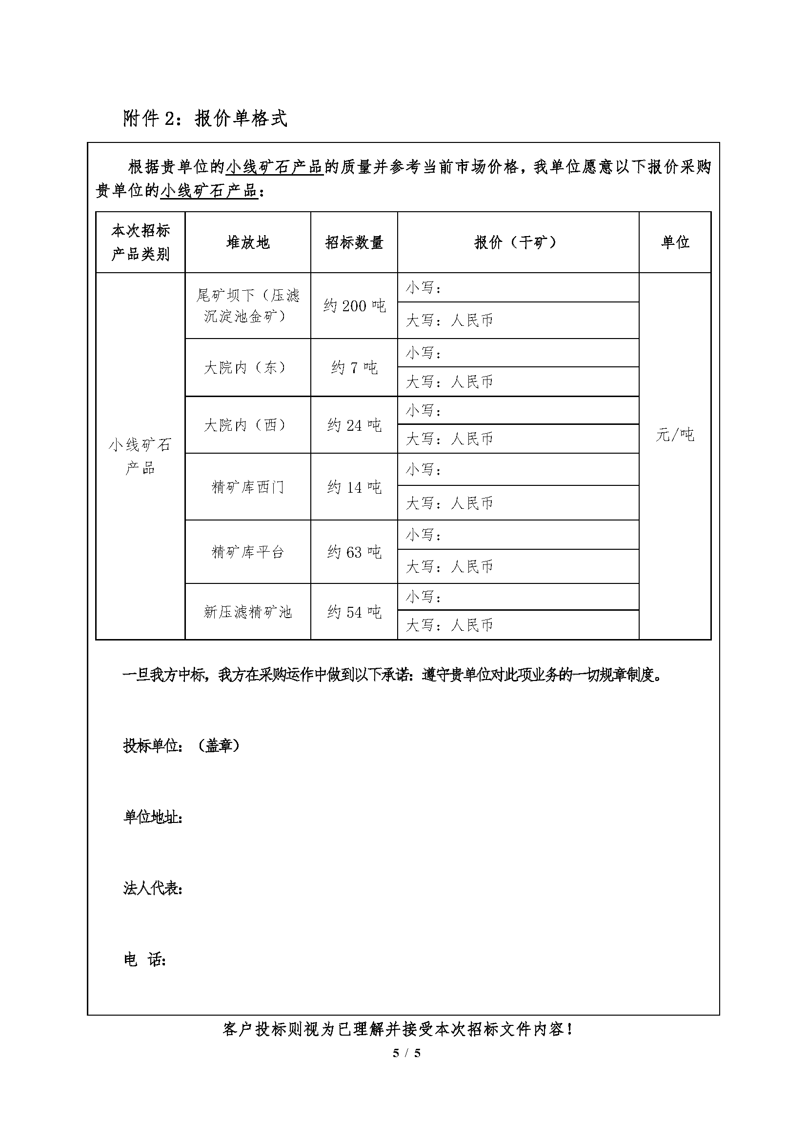 注:本次招標(biāo)產(chǎn)品數(shù)量為預(yù)估數(shù),投標(biāo)按干礦報(bào)價(jià),中標(biāo)結(jié)算濕礦以實(shí)際過磅數(shù)為準(zhǔn),高品位礦石及小線礦石水分按2%扣除計(jì)算干礦。小線產(chǎn)石產(chǎn)品水分由中標(biāo)人及我公司相關(guān)科室、車間人員現(xiàn)場(chǎng)取樣、我公司化驗(yàn)室的水分?jǐn)?shù)據(jù)為準(zhǔn)。如中標(biāo)人需要,我公司開具甘肅省增值稅普通發(fā)票(黃金)。