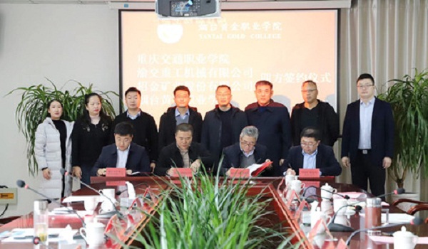 招金礦業股份有限公司與重慶交通職業學院、煙臺黃金職業學院、重慶渝交重工機械有限公司在煙臺黃金職業學院簽署戰略合作協議。